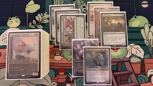 Готовая для игры колода продается уже в двойных протекторах Dragon Shield. Карты на русском и английском языках в состоянии SP, фойление и выпуск можно посмотреть по ссылке https://moxfield.com/decks/SB7HPtikuEmSBqIyQ7gKng