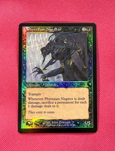 Ретро фойловенький Дестенёвый Фирексийский Негатор на английском языке. Карта в немного поигранном состоянии, долгое время находилась в коллекции и не доставалась. Имеются незначительные микроскопические царапинки на рубашке и на лицевой стороне вверху слева незначительная микропродавленность заметная под определенным углом. Ссылки на дополнительные фото: