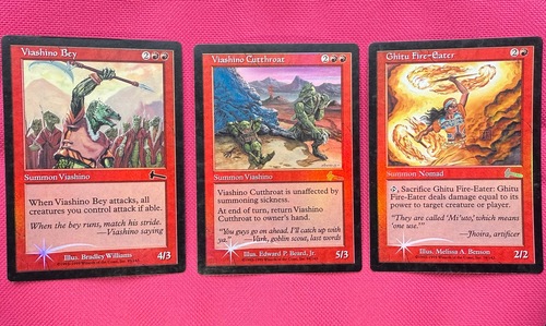 Три красных ретро фойловеньких карты из Легаси в немного поигранном состоянии. Ссылка на фотографию рубашек: https://ibb.co/TBr0QBHQ
