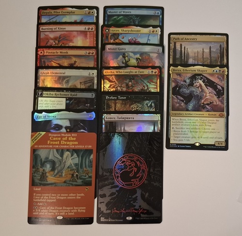 Конец Лабиринта Prerelease Ru Foil 152/156; Profane Tutor MH2 Retro Foil 401; Alesha, Who Laughs at Fate FDN 0115 Prerelease Foil; Mister Gutsy PIP Foil 0433; Arcee, Sharpshooter BOT 007/015 Foil; Master of Waves DDT 001/063 Foil; Cave of the Frost Dragon AFR 350 Foil; Eye of Vecna AFR 393 Extended Foil; Okiba Reckoner Raid NEO 117/302 Foil; Glyph Elemental MH3 0027 Foil; Pinnacle Monk MH3 0246 Foil; Burning of Xinye V14 002/015 Foil; Depala, Pilot Exemplar SLD 464 Foil; Breya, Etherium Shaper MH3 0289 Foil; Path of Ancestry CMR 353/361 Foil; Foil Ink Mountain 368 ONE