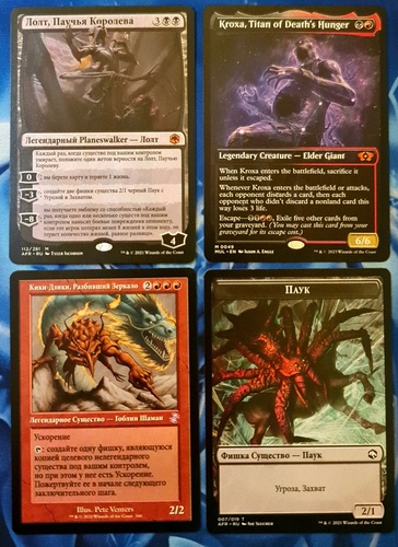 Кики-Дзики, Разбивший Зеркало (TSR, #346), Лолт, Паучья Королева (AFR, #112)+ Токен паук (AFR, #007), Kroxa, Titan of Death's Hunger (MUL, #0049)