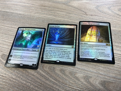1 Уджин, Невыразимый (RU, NM, PWAR, #002p, planeswalker stamp, FOIL) 1 Serum Powder (EN, SP, IMA, #228, FOIL) 1 Символ Прародителей (RU, NM, M20, #229, FOIL)