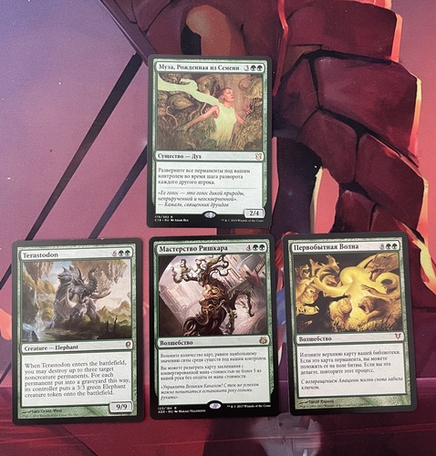 1) Муза, Рожденная из Семени (С19, ру, NM) 2) Первобытная Волна (#189, AVR, nm) 3) Мастерство Ришкара (AER, #123, nm) 4) Terastodon (con, #181, sp)