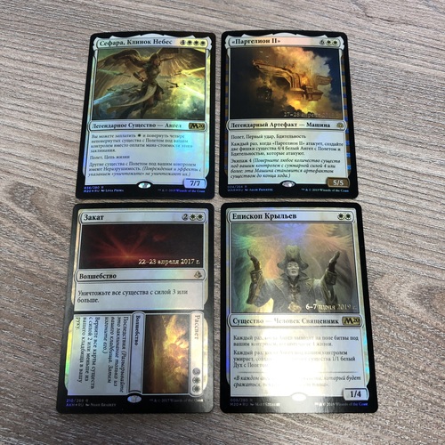 1 Закат // Рассвет (RU, SP, PAKH, #210s, prerelease, FOIL) 1 «Паргелион II» (RU, NM, PWAR, #024s, prerelease, FOIL) 1 Епископ Крыльев (RU, NM, PM20, #008s, prerelease, FOIL) 1 Сефара, Клинок Небес (RU, NM, M20, #036, FOIL)