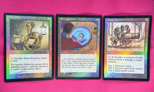 Три ретро фойловеньких артефакта из Дестани (два анкомона и один рар). Два из них с иллюстрациями от DiTerlizzi. Карты в немного поигранном состоянии. Ссылки на дополнительные фотографии: