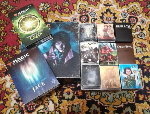 9 пластиковых коробочек, в том числе, 2 с Regional ProTour Qualifier'ов. Один большой Gift Box Тени над Иннистрадом. По коробочке от специальных выпусков: Commander Collection: Green и Sognature Spellbook: Jace