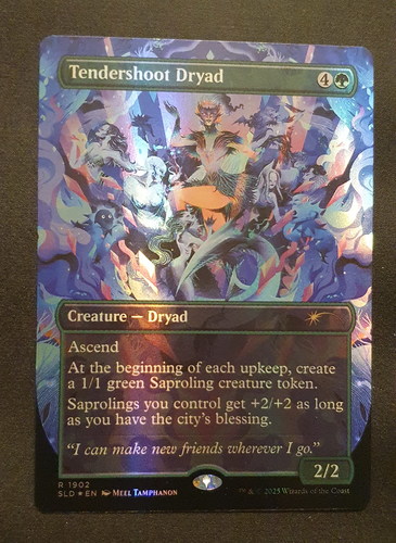 Фойловая карта Tendershoot Dryad с уникальным безрамочным артом из набора Secret Lair Deck: Everyone's Invited в отличном состоянии.