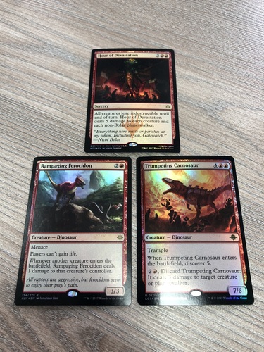 Hour of Devastation (EN, NM, HOU, #097, FOIL) Rampaging Ferocidon (EN, NM, XLN, #154, FOIL) Trumpeting Carnosaur (EN, NM, LCI, #171, FOIL)