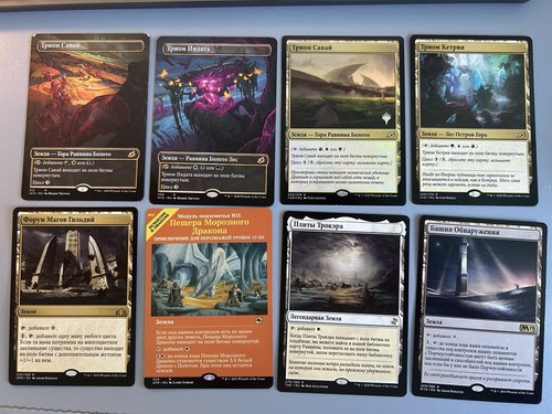 4 русских триома земли и 4 бонусных земли в разном состоянии (какие-то вскрывались самостоятельно, какие-то покупались с рук), считайте, что всеми картами играли.