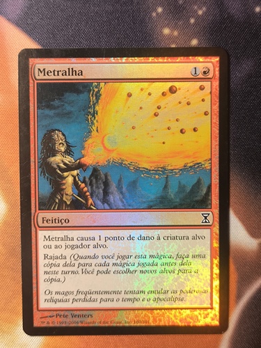 Выставляется на аукцион фойловый Grapeshot из родного сета Спираль Времени на Португальском. Карта долгое время хранилась в альбоме. Присутствуют небольшие царапины, небольшие вмятины, а так же небольшой клаудинг. Оцениваю как SP-/MP+.
