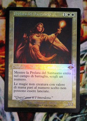 Фойловый олбордерный Sanctum Prelate, промка к дисплеям MH2, на итальянском языке. Карта новая, не игралась, хранилась в протекторах.