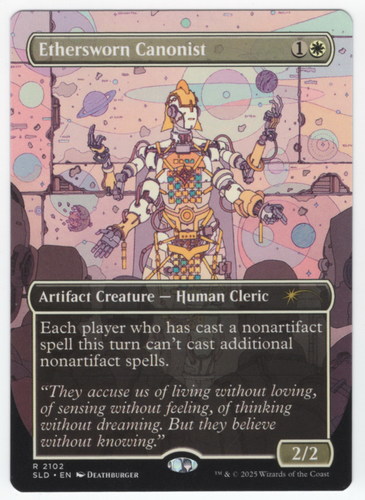 Карта Ethersworn Canonist с уникальным безрамочным артом из набора Secret Lair: Featuring: Deathburger. Карта в отличном состоянии.