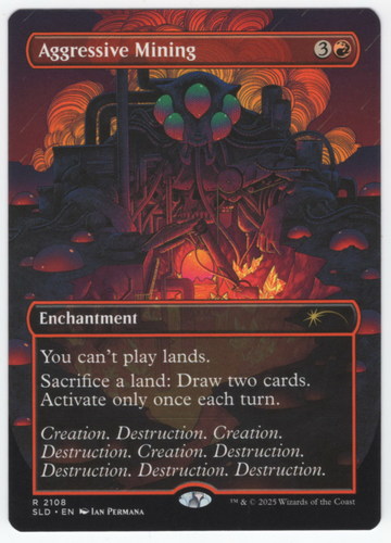 Карта Aggressive Mining с уникальным безрамочным артом из набора Secret Lair: Alien Auroras. Карта в отличном состоянии.