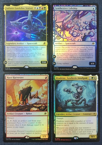 Infinite Guideline Station Foil regular EOE#0219, Synthesizer Labship Foil Prerelease EOE#0081, Rust Harvester Foil regular EOE #0159, Dyadrine, Synthesis Amalgam Foil Prerelease EOE0216 состояние отличное картами не играли но поставлю SP