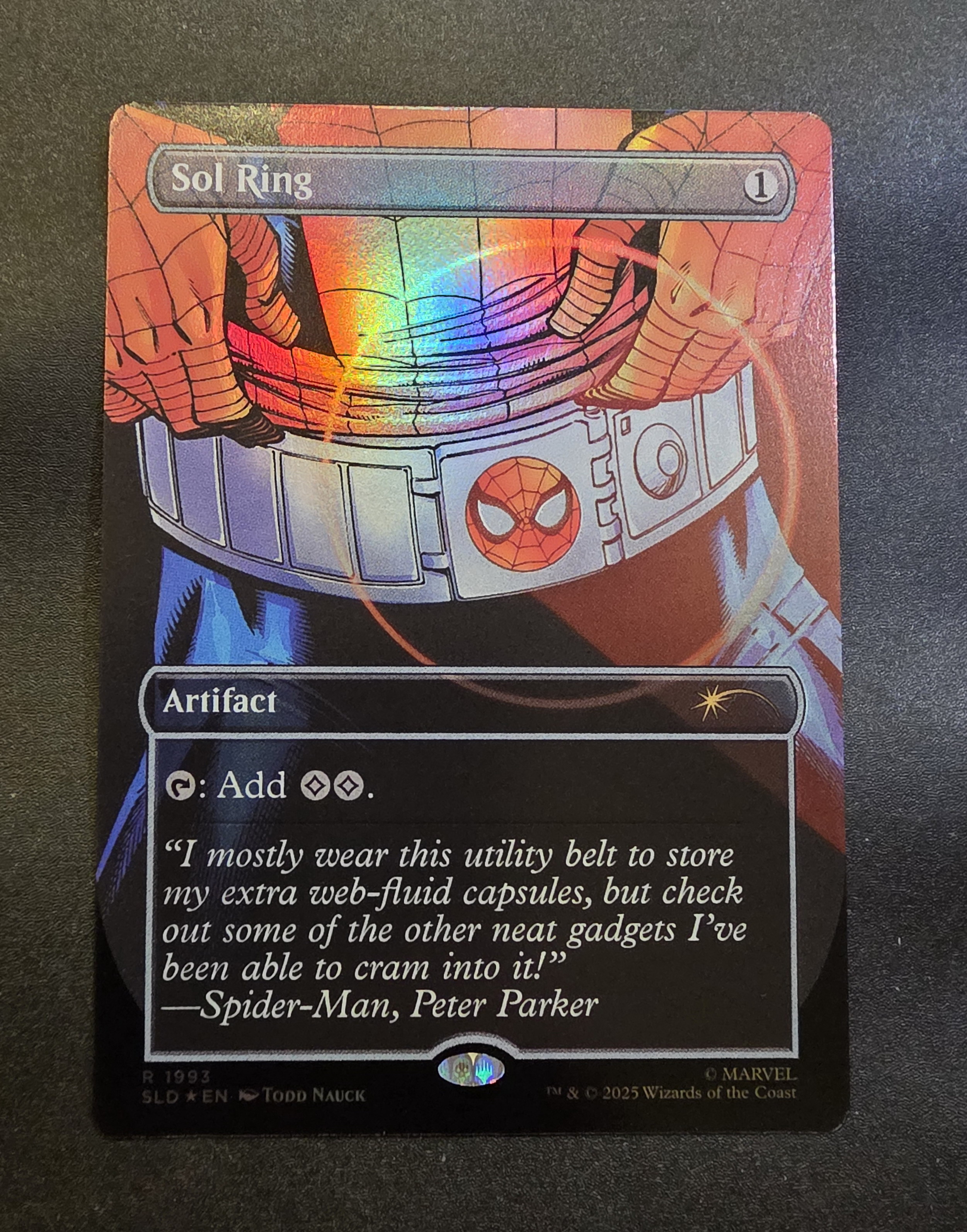 Фойловая карта Sol Ring с уникальным безрамочным артом из набора Secret Lair x Marvel's Spider-Man: Heroic Deeds. Карта в отличном состоянии.
