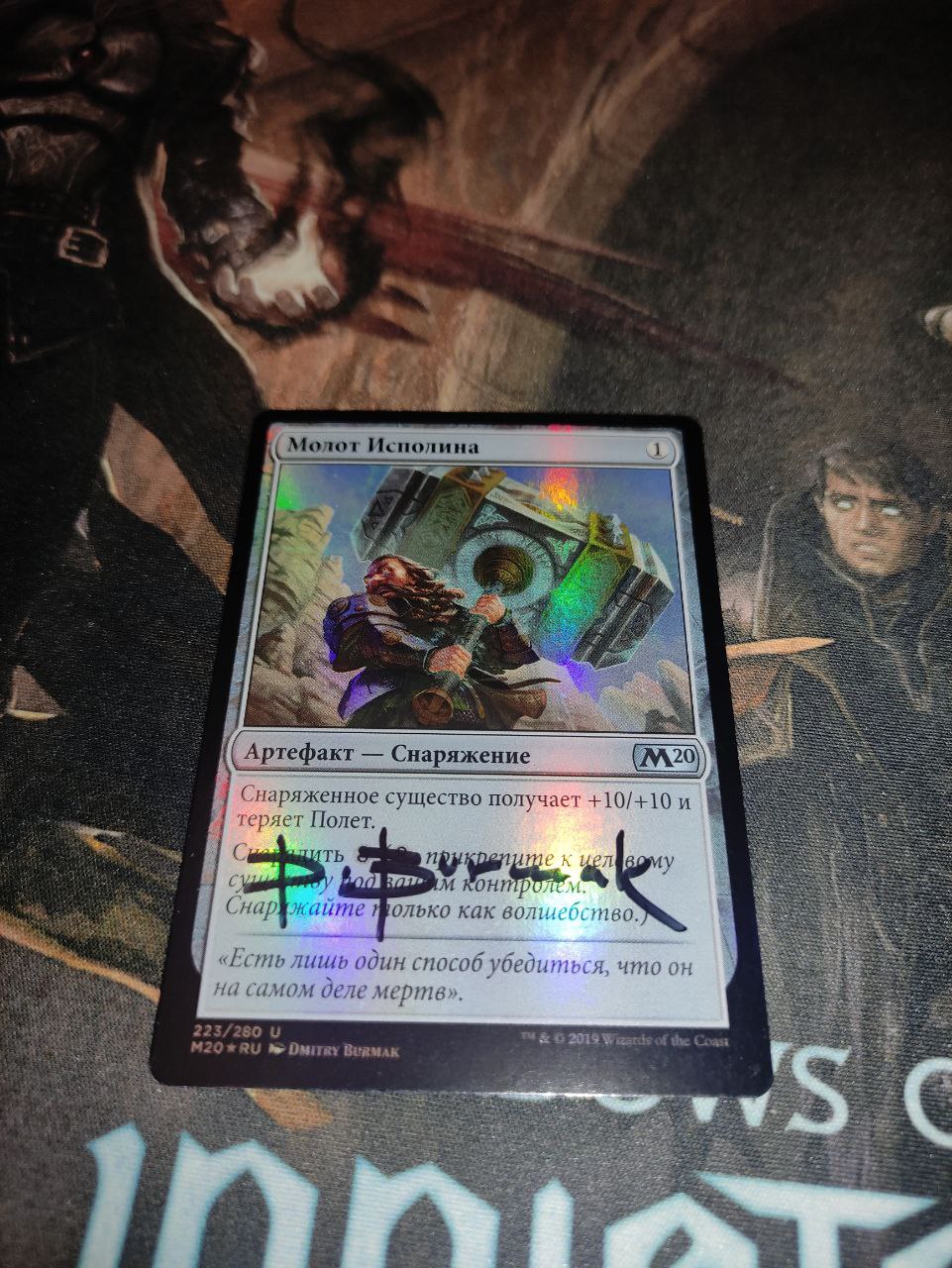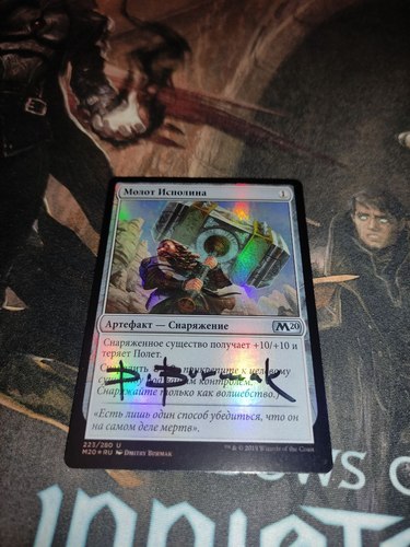 Colossus Hammer/Молот Исполина с подписью художника (NM, RU, FOIL, M20 223/280) - игрался и хранился исключительно в двойном протекторе. Несмотря на его новенький вид, молот бывалый в боях, трижды доходил со мной до финала Тульского турнира, неоднократно круша оппонентов в самый неожиданный момент, выпрыгивая, как чертик из табакерки (под Sigarda's Aid :) ).