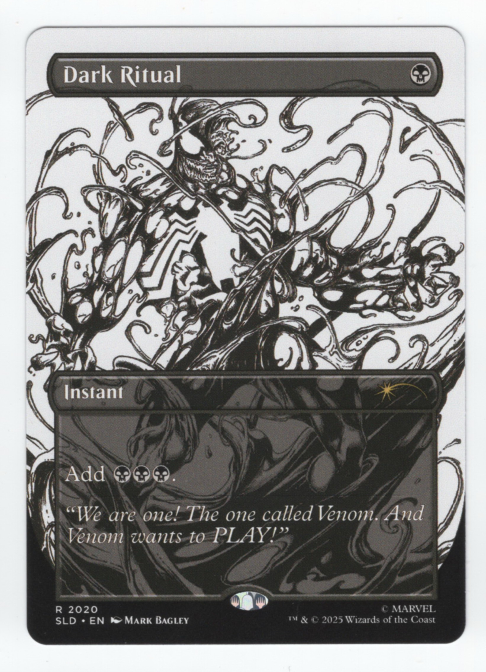 Черно-белая карта Dark Ritual с уникальным безрамочным артом из набора Secret Lair x Marvel's Spider-Man: Venom Unleashed (Inks). Карта в отличном состоянии.