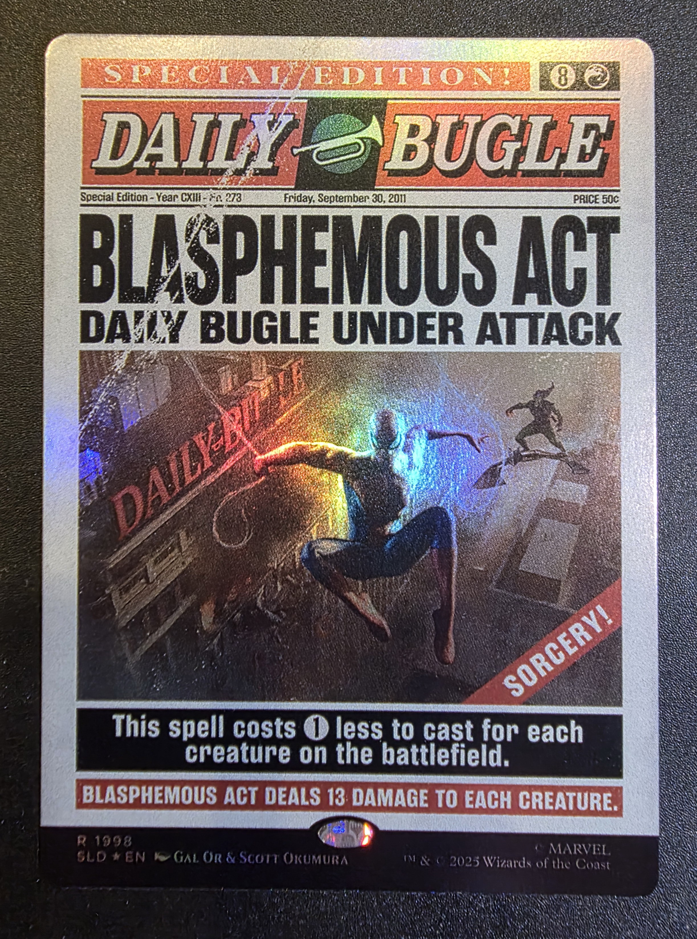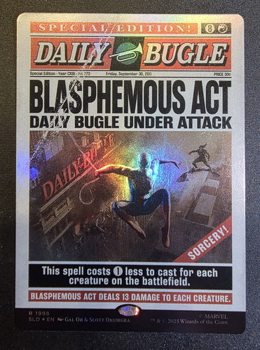 Фойловая карта Blasphemous Act с уникальным безрамочным артом из набора Secret Lair x Marvel's Spider-Man: Daily Bugle Breaking News. Карта в отличном состоянии.
