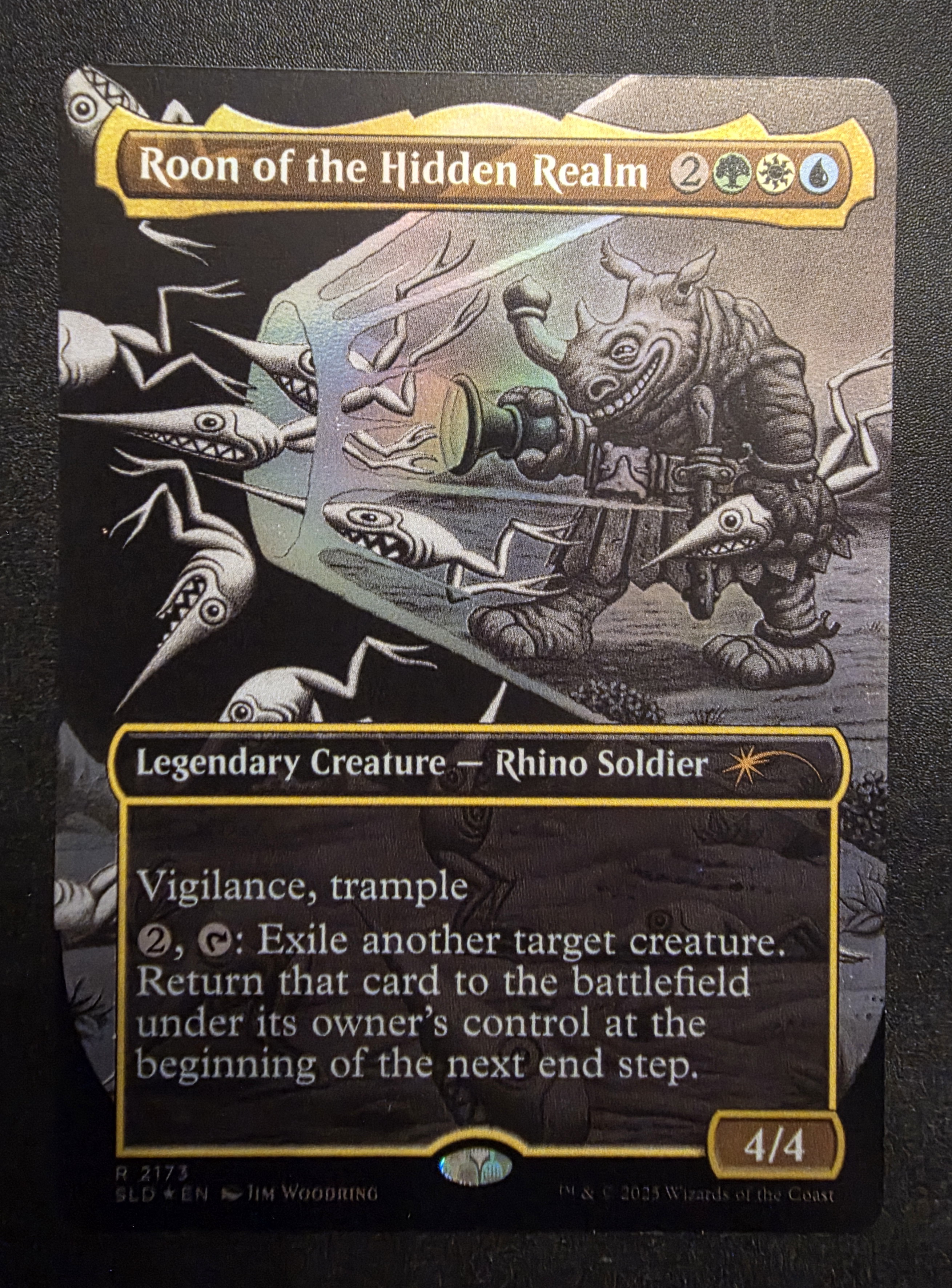 Фойловая карта Roon of the Hidden Realm с уникальным безрамочным артом из набора Secret Lair: Dreaming Darkly. Карта в отличном состоянии.