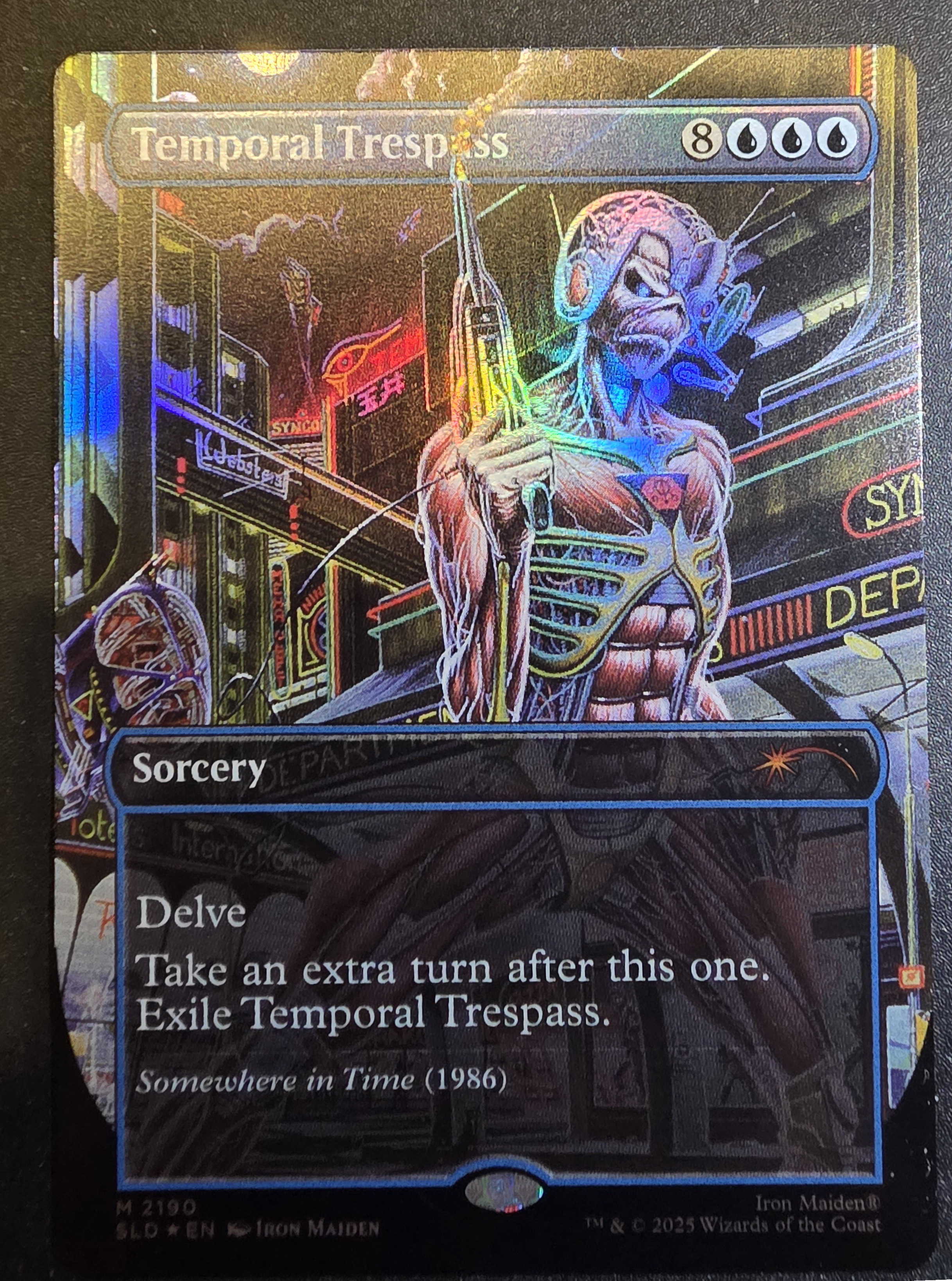 Фойловая карта Temporal Trespass с уникальным безрамочным артом из набора Secret Lair x Iron Maiden: Album Art. Карта в отличном состоянии.