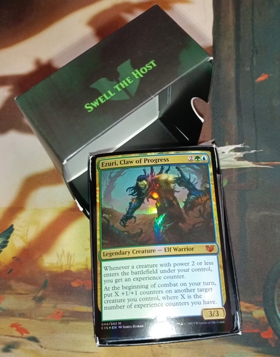 Коробка с незначительными потертостями. Все карты и токены на месте, всё, кроме оверсайз-командира, в протекторах.