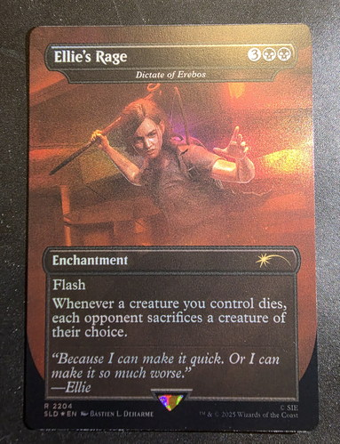 Фойловая карта Dictate of Erebos с уникальным безрамочным артом из набора Secret Lair x The Last of Us Part II. Карта в отличном состоянии.