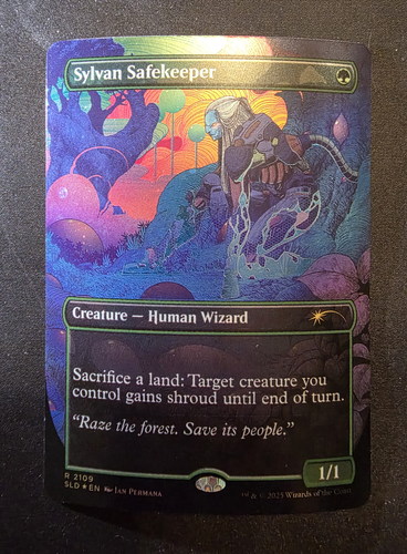 Фойловая карта Sylvan Safekeeper с уникальным безрамочным артом из набора Secret Lair: Alien Auroras. Карта в отличном состоянии.
