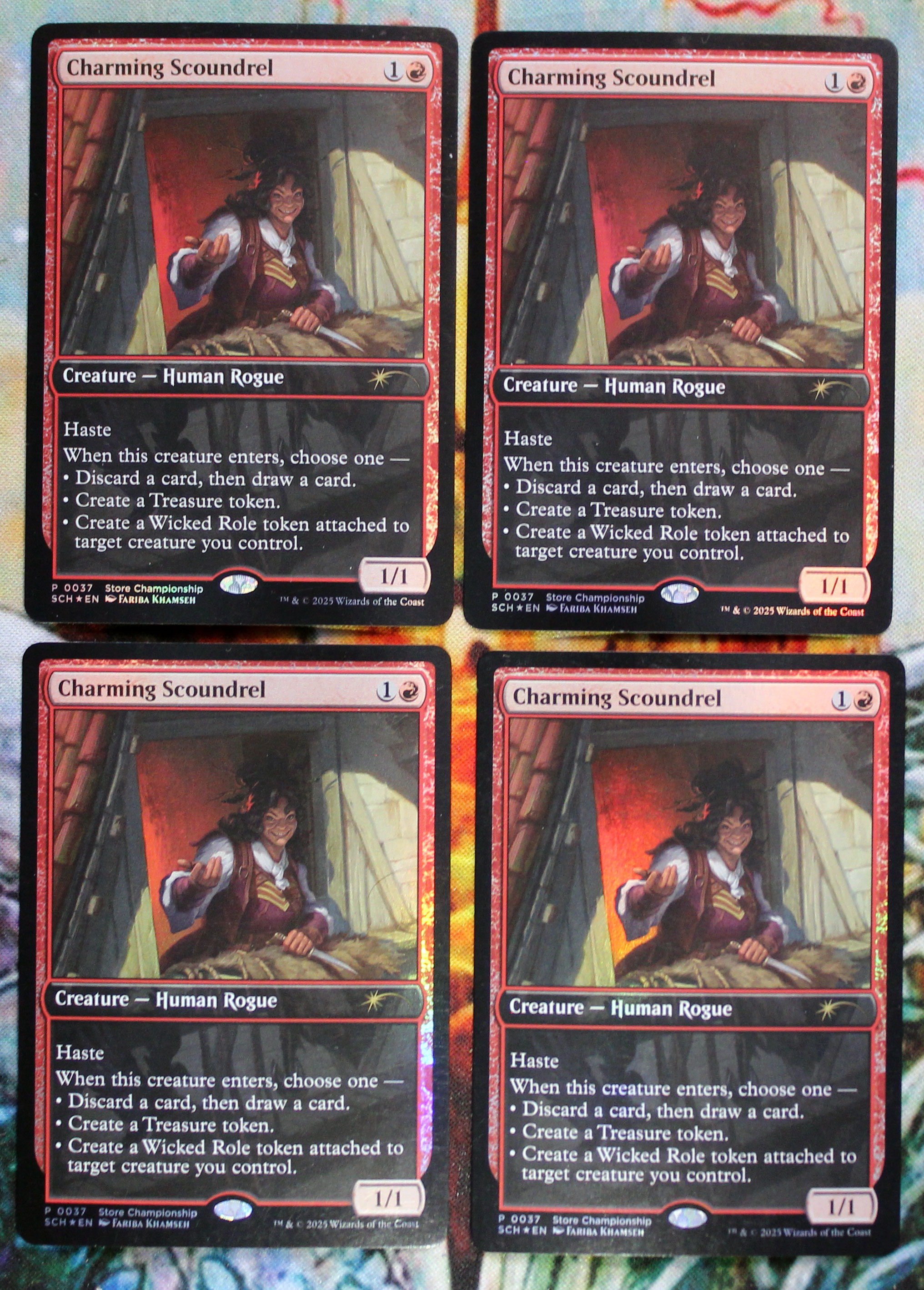 Комплект фойловых промочных Charming Scoundrel с чемпионата магазина. Карты новые, не игрались, хранились в протекторах.