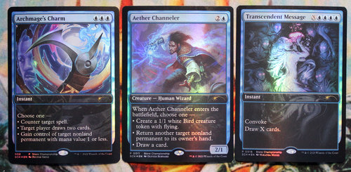 Фойловые промки с чемпионата магазина: Archmage's Charm, Aether Channeler и Transcendent Message. Карты новые, не игрались, хранились в протекторах.