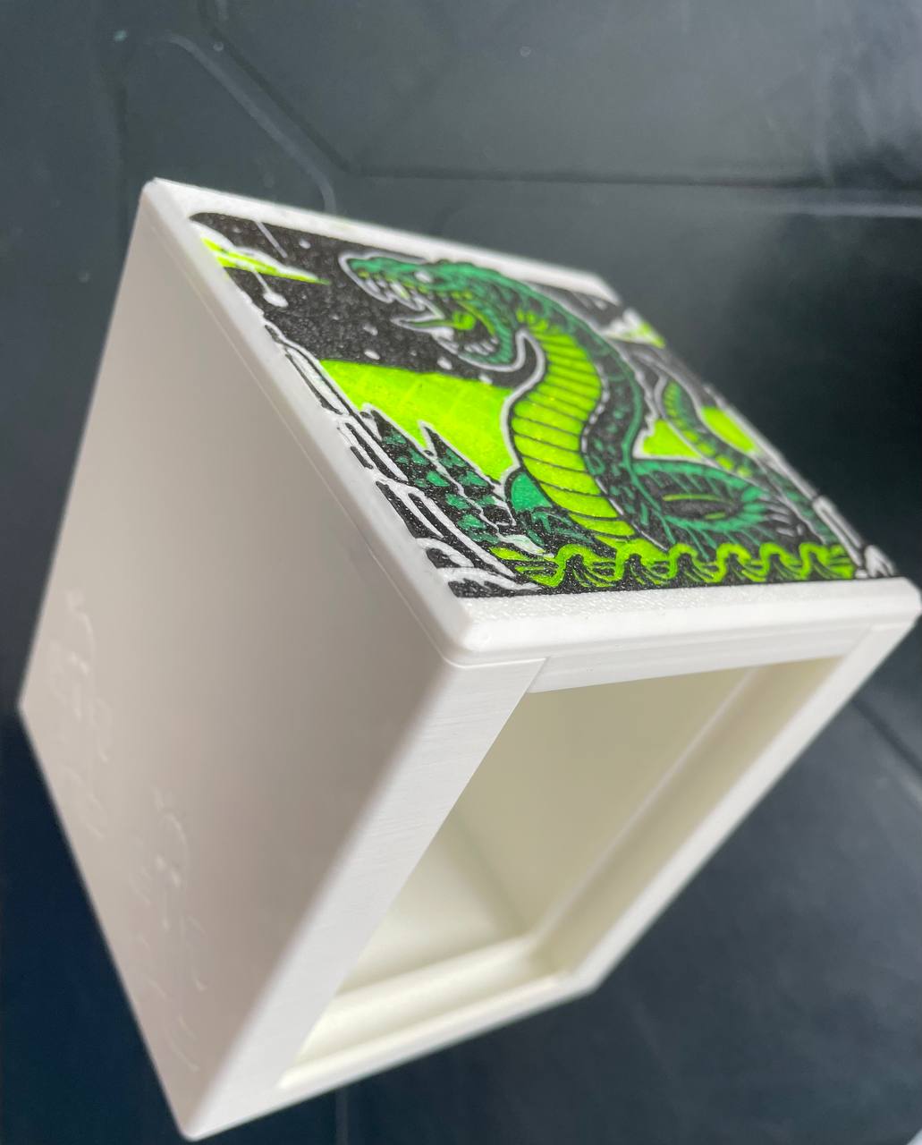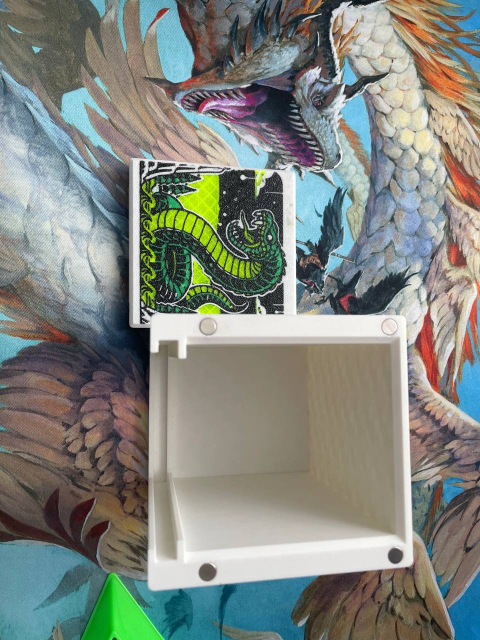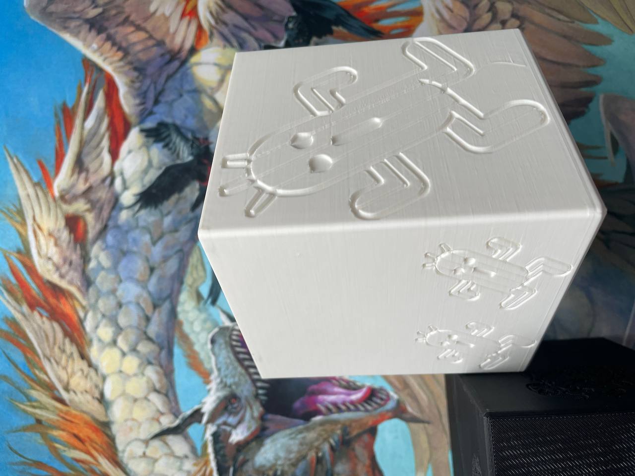Декбокс сделан на 3d принтере из пластика фиксируется магнитами, в декбоксе помещаются 100 карт в двойных протекторах(удобно для хранения командиров ЕДХ)!