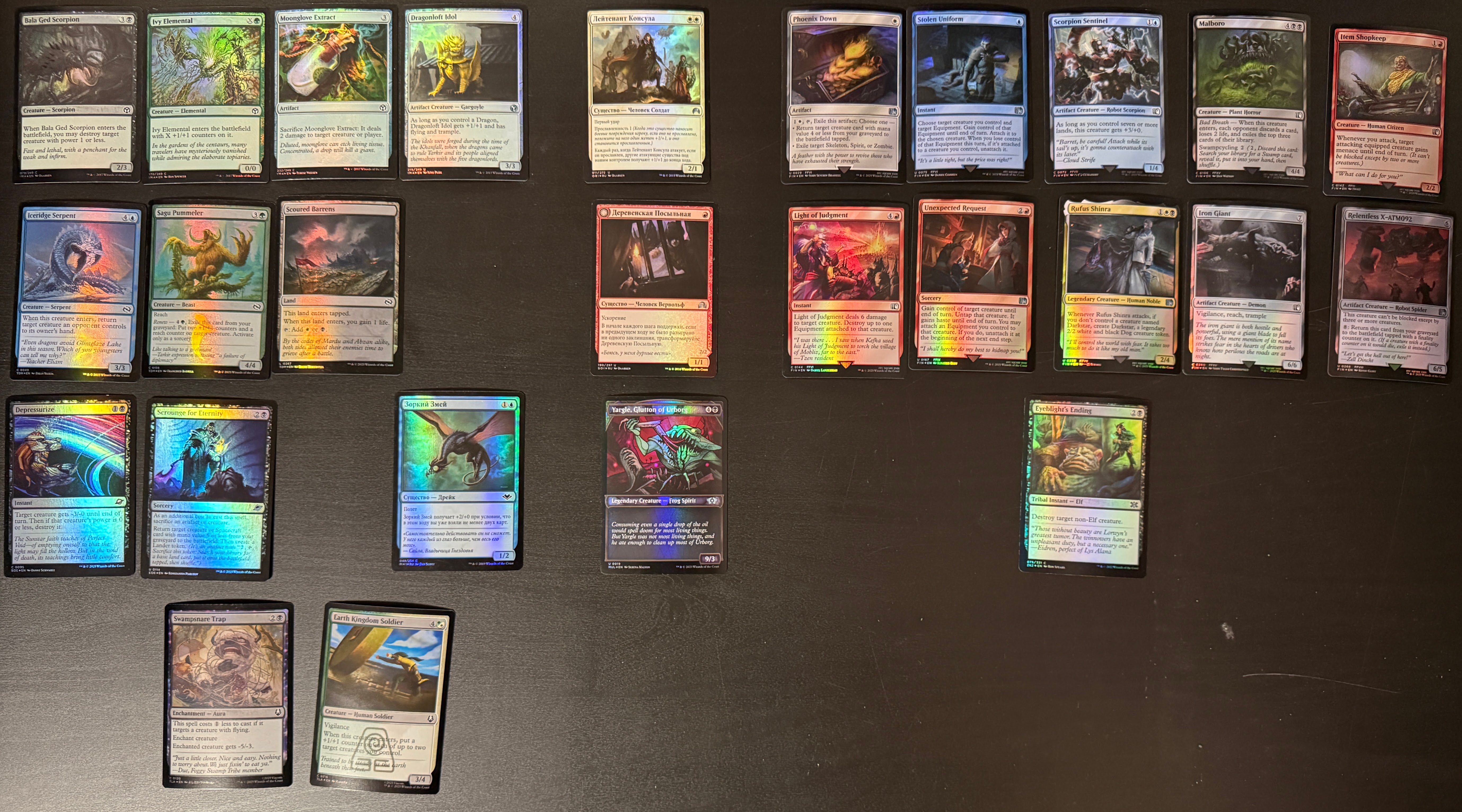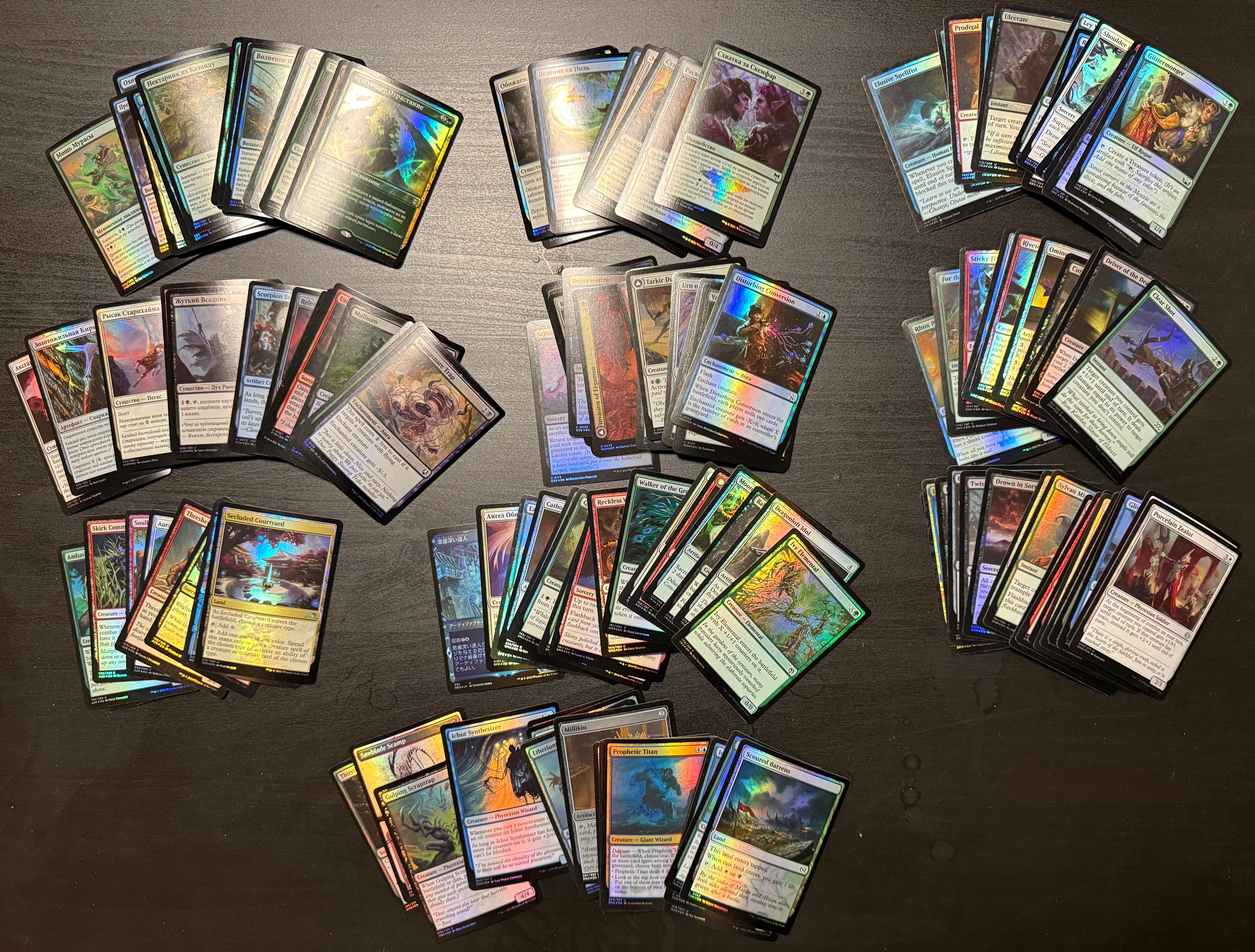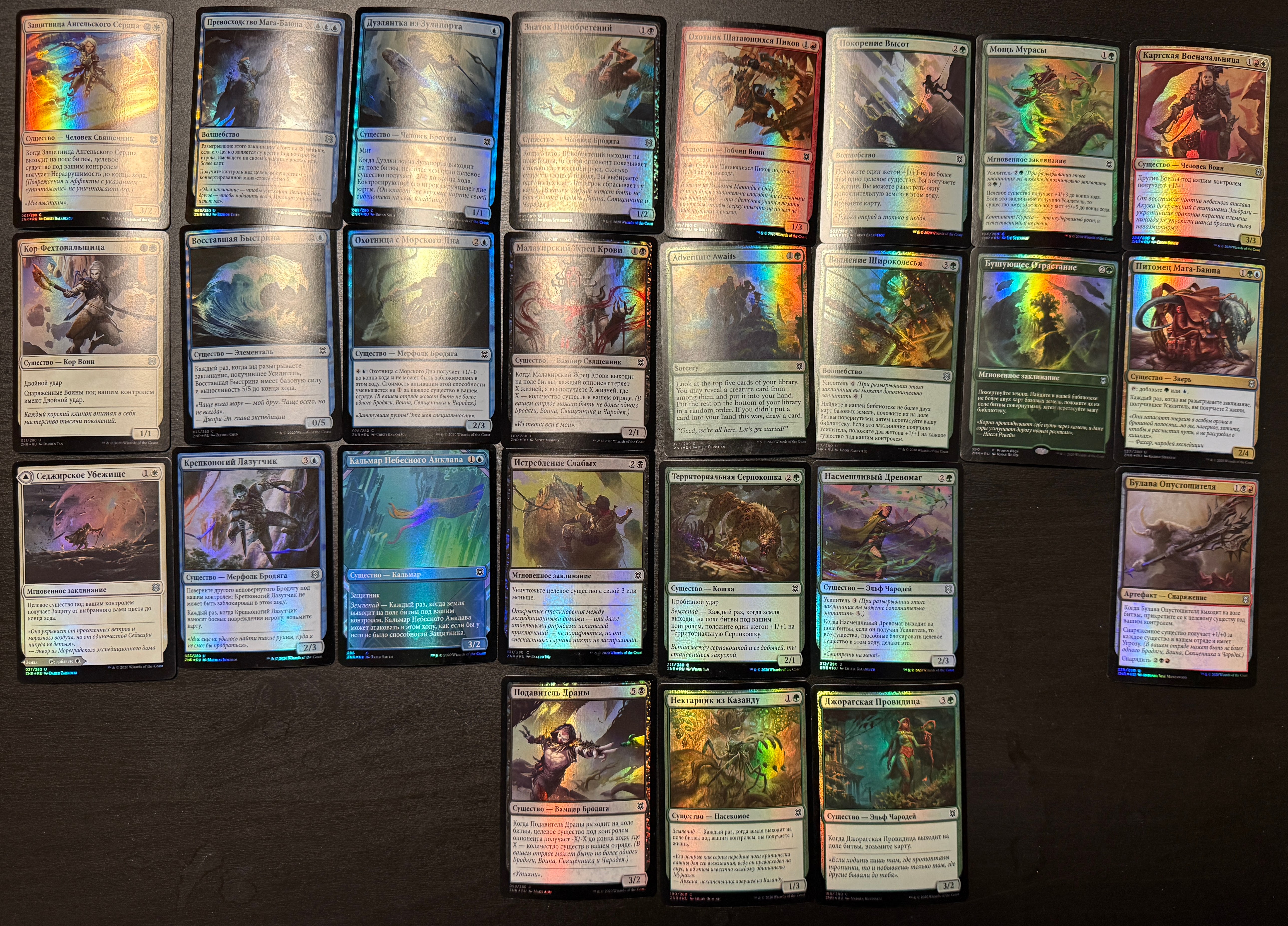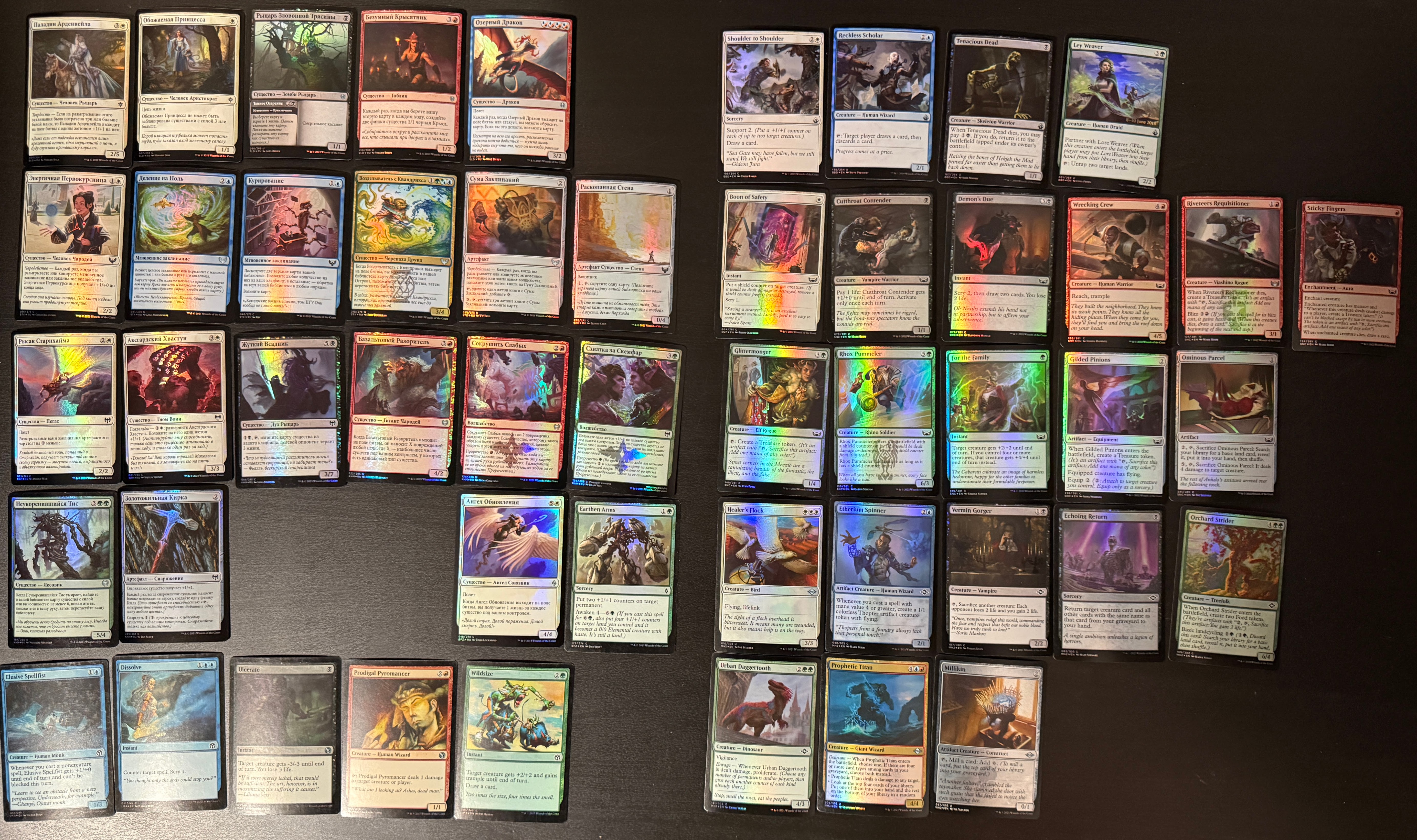 В хорошем состоянии. Большая часть NM. Языки примерно 50/50 русский и английски, есть пара немецких и одна японская