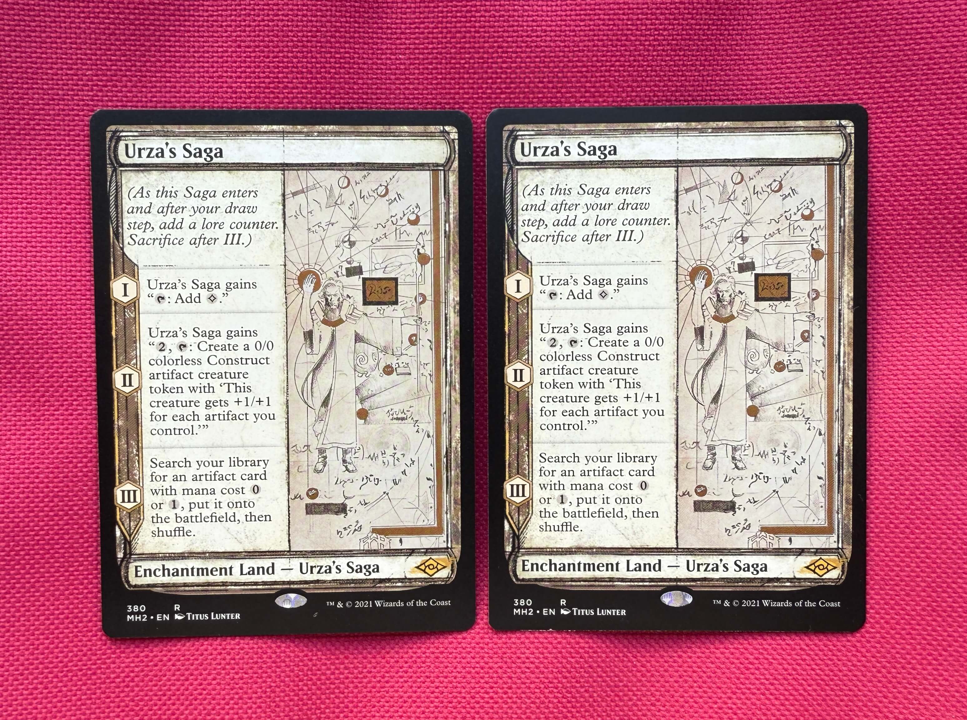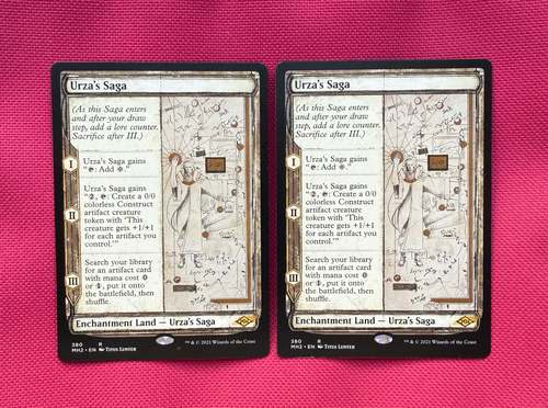 Пара свежевскрытых Саг об Урзе (скетч версия) на английском языке. У одной грубоватый заводской разрез внизу, а у другой возле голограммы имеется микроскопическая заводская точка рисунком. Ссылка на доп. фотографии: