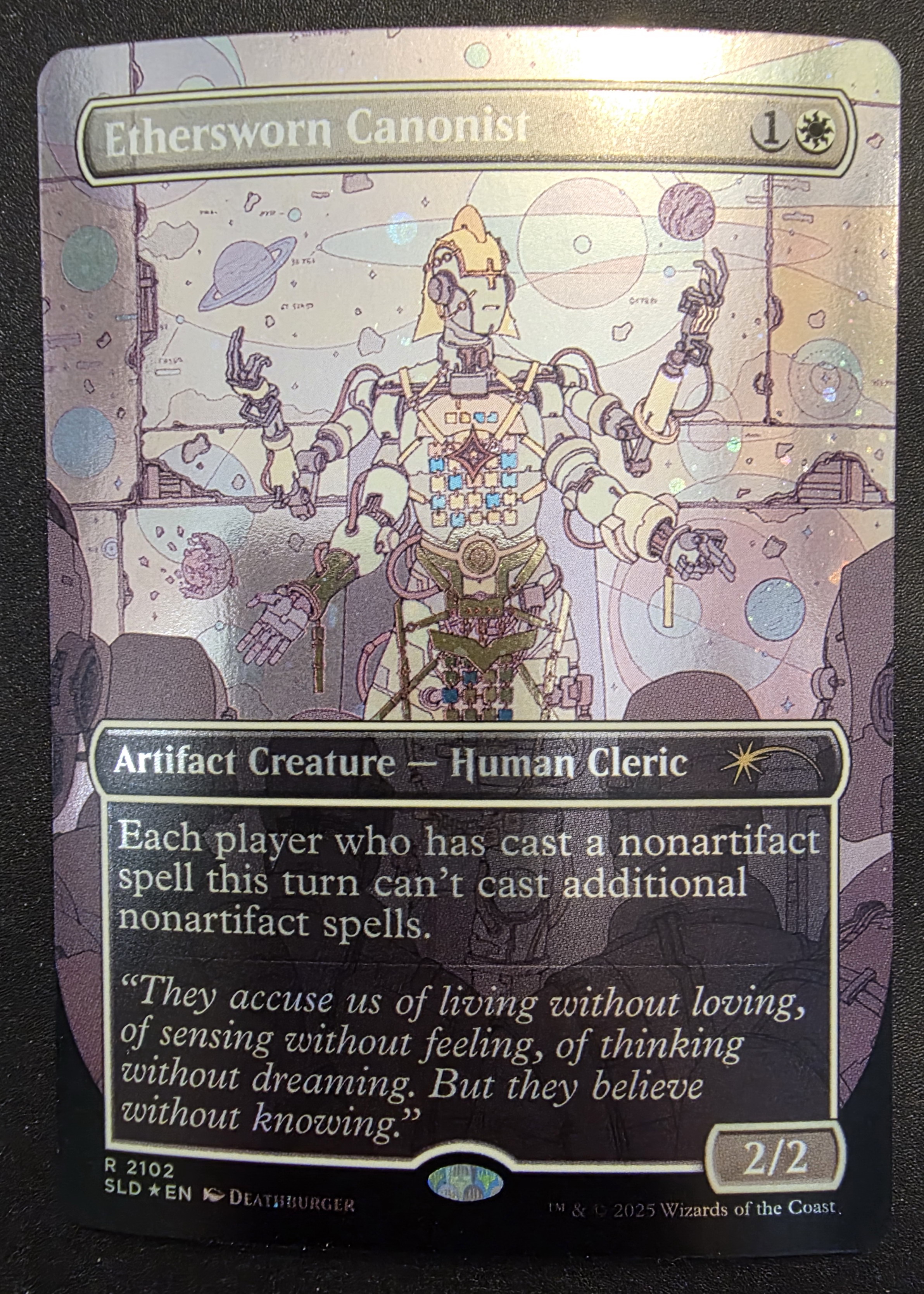 Фойловая карта Ethersworn Canonist с уникальным безрамочным артом из набора Secret Lair: Featuring: Deathburger. Карта в отличном состоянии.