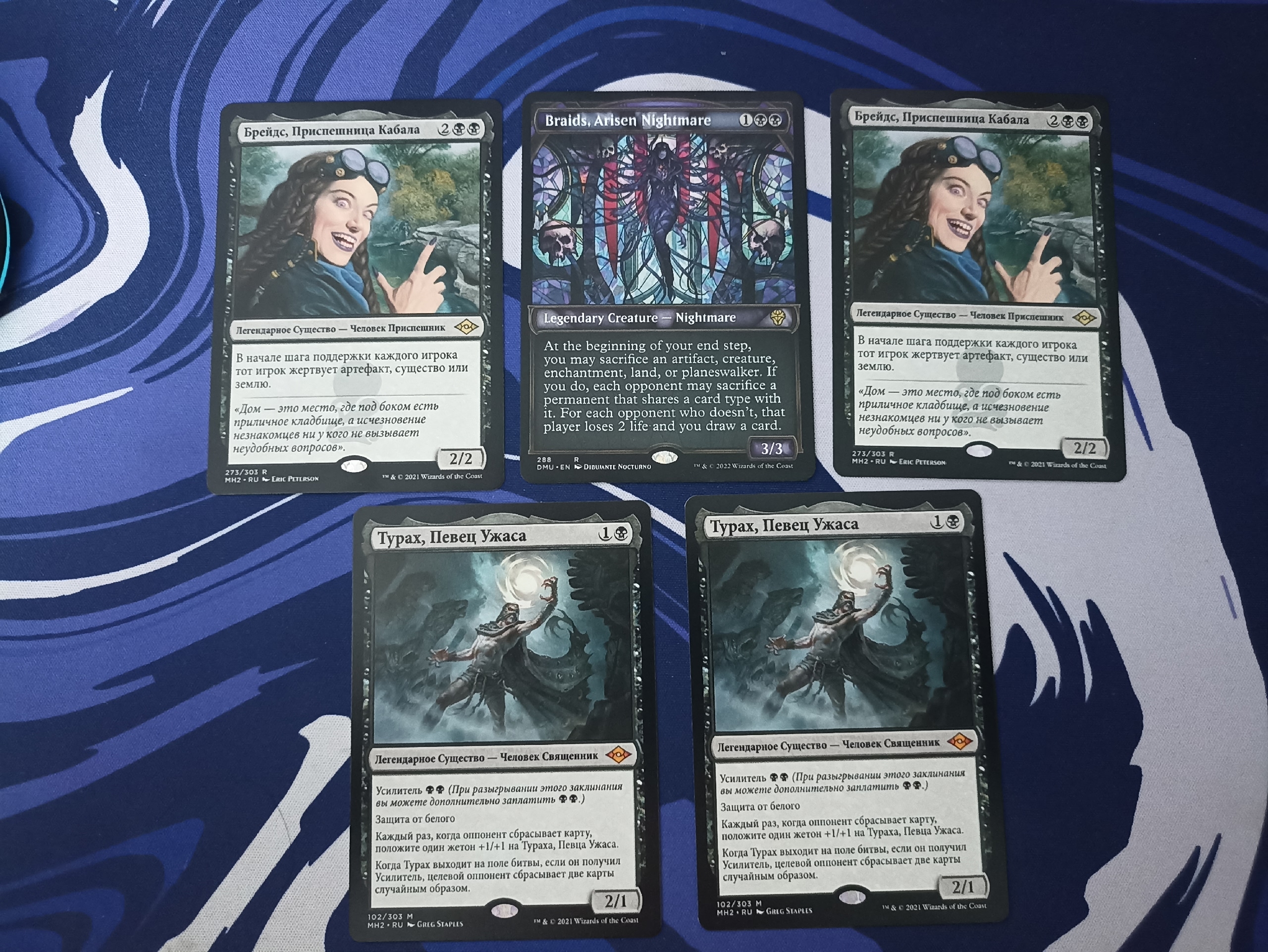 Отдам кошмарную Брейдс, вместе с двумя простыми приспешницами Брейдс и двумя Турахами (неплохая компания). Карты все время находились в двойных протекторах и в альбоме.