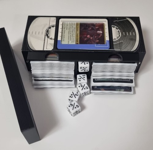 Командирский DeckBox. Изготовлен на 3д принтере, гарантировано вмещает 100+ карт в протекторах, кастомизирован в стиле видео касеты. Крышка плотно закрывается и удерживается магнитами.
