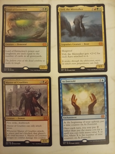 Продам 4 мифика 2х2: "Lord of Extinction", "Master of Cruelties", "Uril, the Miststalker" и "As Foretold" (2x2, #244,251,290,038, ENG, NM), карты попали из бустеров в альбом и не видели ни одной партии.