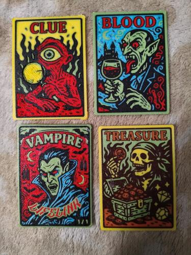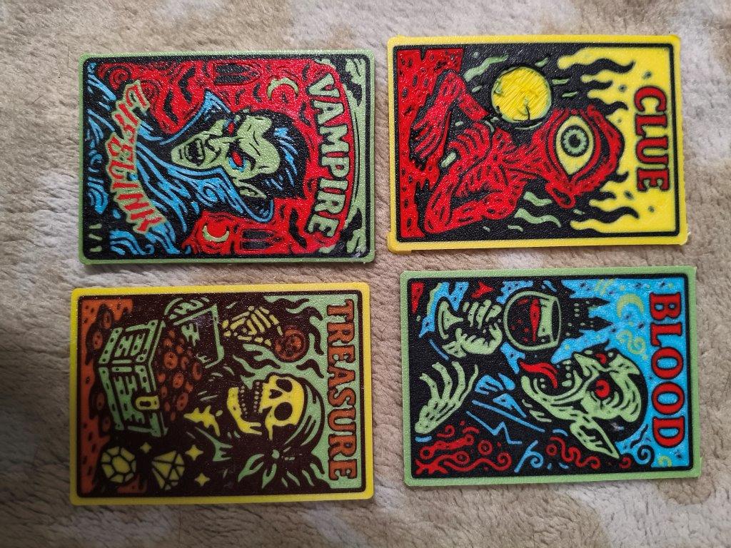 4 токена, изготовленные по оригинальному авторскому дизайну (не моему) . Выполнено в стиле huefordge из качественного пластика. Карточка прочная толщина 1,5мм. Краски гораздо ярче чем на фотографии.