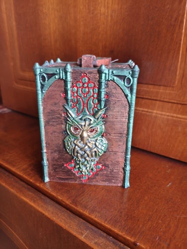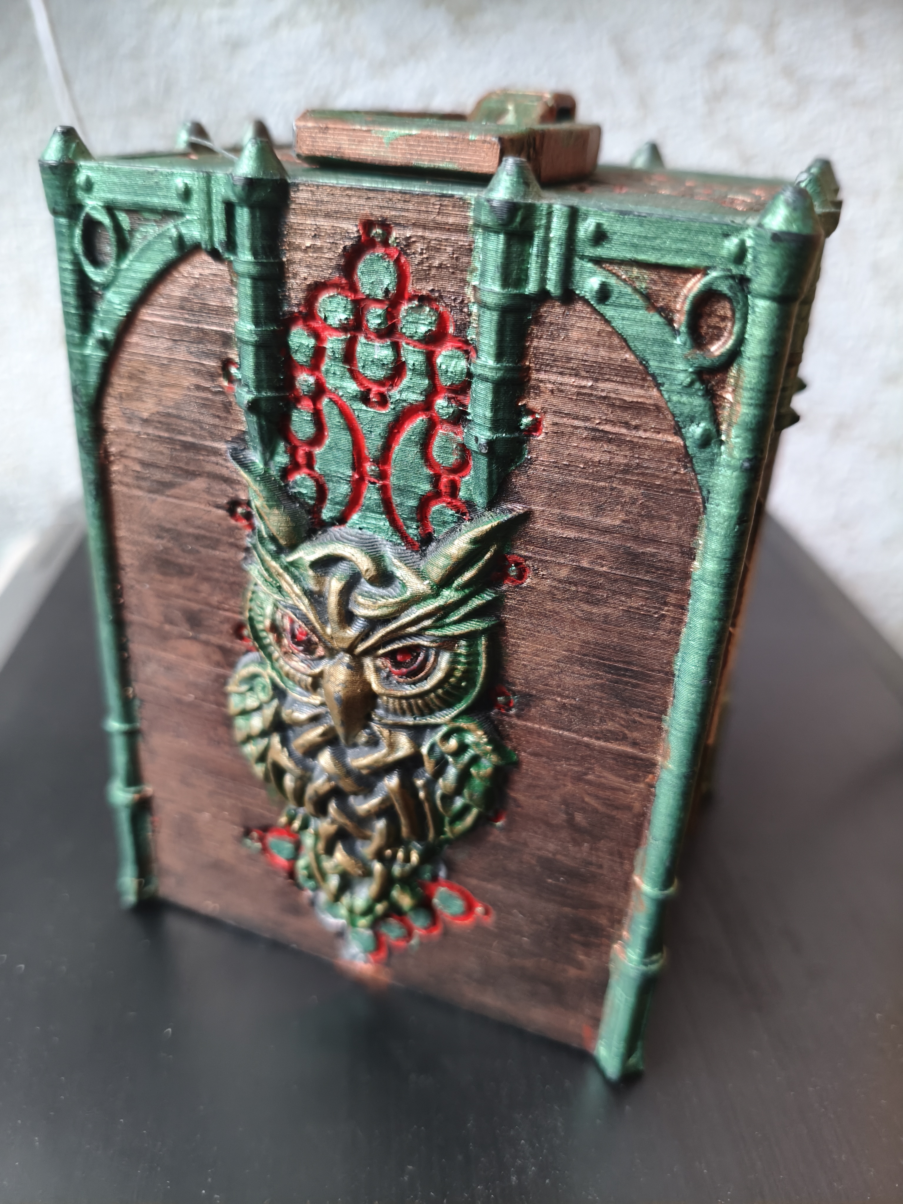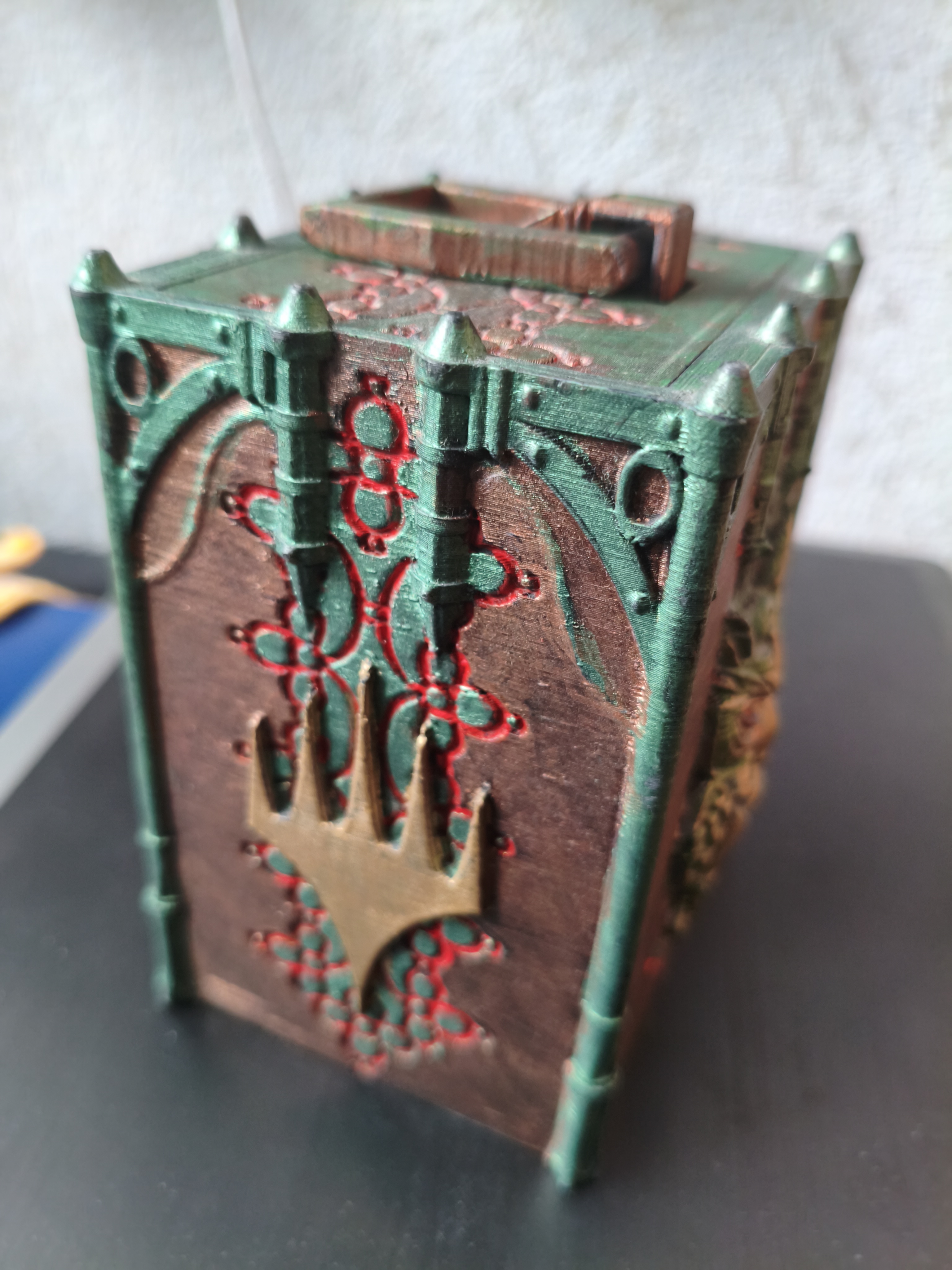Изготовлено с помощью 3D печати. Использована окраска под медь (красная плюс зеленая патина) Очень эффектно смотрится! Коробка на 75 карт (60+15)