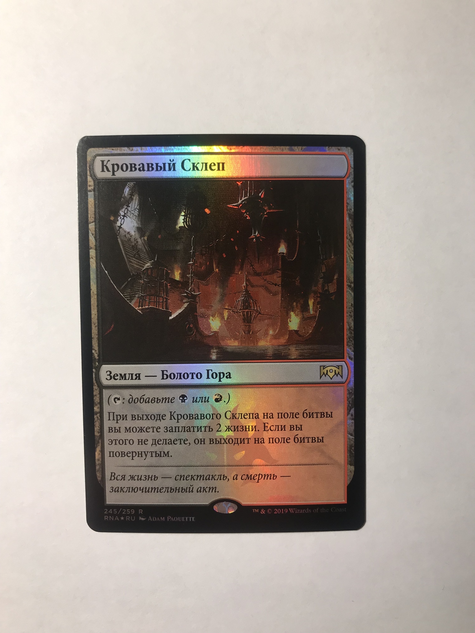 Продается русский фойловый Кровавый Склеп из RNA. Из бустера был сразу помещен в двойной протектор. Видимых повреждений не обнаружил.