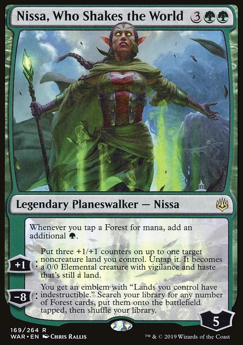 Играю в 2 nissa, who shakes the world и мне она нравится больше, чем красис. Во-первых, это всегда угроза затоптать землями, во-вторых, она за счет статической способности позволяет реализовать КА наших карт. Если она проживает ход (оживление stomping ground или breeding pool позволяет защитить с помощью stomp или petty theft), то на следующий ход у нас есть около 10 маны чтобы реализовать любой план - разыграть накопившиеся карты в руке/приключении, сыграть escape to the wilds, найти больше земель и карт, раскастовать их, либо залезть в сайдборд и сыграть любую опцию в этот же ход, либо просто завалить стол кричами и обдроваться через иннкиперов.