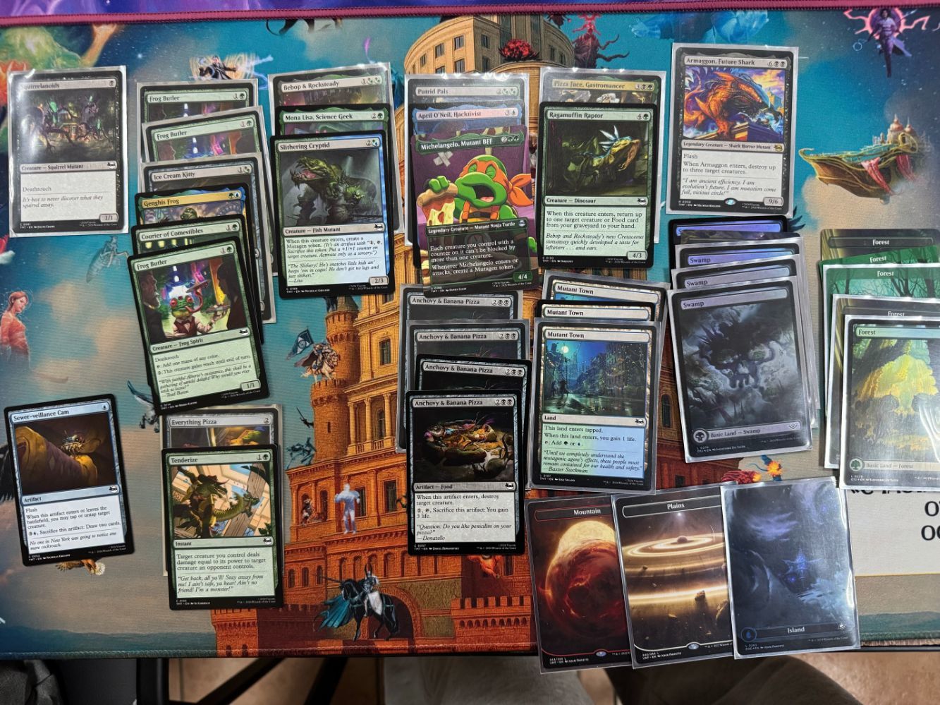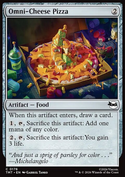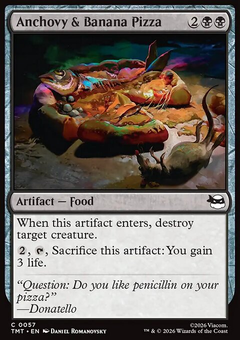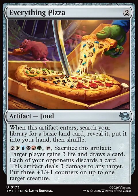 enotpaniker Опубликовано: 2 часа назад Поделиться Опубликовано: 2 часа назад (изменено) Всем привет! Текстом ниже хочу обратить ваше внимание на карточку, которая способна сделать ваши драфты по TMNT чуточку веселей - Everything Pizza. Изначально карта для меня выглядела как мем и драфтить я её начал как мем, но после нескольких успешных драфтов и миррора пицц в хай мифике арены стало понятно, что в этом что-то есть. Сейчас сила карты уже наверное ни для кого не секрет, так давайте поговорим о том, как это должно драфтиться. Как сесть? Я не выделял бы деки с пиццой в отдельный архетип, это скорее вариация в BUG гринде с зеленой основой. Вторым цветом черный мне в принципе нравится больше, чем синий, но для пиццы разница еще заметней из-за синергий с разной едой. Отсюда вытекает алгоритм «присаживания» в архетип – первые несколько пиков ложатся в какой-то спектр BUG-а и пицца приходит 5-8 пиком. Можно пикать выше (у меня был кейс вообще с p1p1), но это совсем необязательно, т.к. карте не так уж много помощи нужно от остальных ваших пиков и запихнуть её в деку не сложно даже в середине второго бустера. Какой план? Тут наверное стоит сказать о том, как на мой взгляд сейчас выглядит мета в целом. Вообще всё просто – с одной стороны два белых архетипа, которые способы очень быстро расчистить 2/3 лица; с другой – тяжелые value колоды (частенько с рекурсией) в BUG спектре с зеленой основой. Я сознательно не разделяю BG и UG, так как по мне деки действуют одинаково и часто через сплеши сливаются в одно понятное месиво. У UG есть как будто какой-то битдаун потенциал, но по-моему он выражен не ярко и успешная UG колода всё равно должна быть ближе к тяжелому midrange или контролю. Между двумя этими противоположностями сидит UR, который в зависимости от конкретных карт может быть быстрее или медленнее, но не предлагает ничего принципиально нового на фоне двух других типов. Соответственно перед любой гриндовой декой стоит задача перегриндить себеподобных и уметь при этом не умирать в первые 4 хода от белых соперников. Everything Pizza делает весомый вклад в решение первой задачи, поэтому во время драфта нам нужно чуть больше приоритета отдать решению второй. Тут всё, как обычно – вторые дропы, дешевый ремувал etc. Для пиццы не нужно играть 5C, в идеале это двухцветная дека, которая может себе позволить посплешить любую бомбу без дабл коста, которую мы вскроем. Пик ордер? Как уже упоминал выше, мы не сильно отличаемся от обычной BUG деки в формате, поэтому я подсвечу только те группы карт, которые становятся сильней именно с пиццой. 1. Courier of Comestibles – можно долго говорить про этого биста. Карта, конечно, крута и без вяских пицц, но тут становится еще мощнее и нужнее. Я стараюсь собирать под курьера некий тулбокс, который в идеале включает в себя дров (Omni-Cheese Pizza), кричу (Ice Cream Kitty / Pizza Face, Gastromancer) и ремувал (Anchovy & Banana Pizza). Everything Pizza добавляет сюда еще и лендроп + разгром в лейте. 2. Дорки-помидорки Frog Butler и Mona Lisa, Science Geek. Хороши по понятным причинам – добивают недостающий цвет для активации и позволяют активировать пиццу раньше. 3. Дешевый ремувал. Во многом из-за этого пункта я в принципе предпочитаю черный синему. Anchovy & Banana Pizza тоже кладу в эту категорию, отсутствие дешевости компенсируется синергиями с едой и хиточками. В синем где-то здесь можно пикнуть Sewer-veillance Cam: карта умеет много всякого за низкий кост, помогает защищатьс